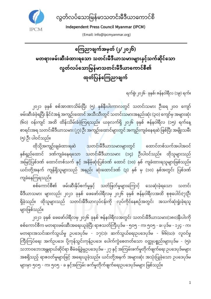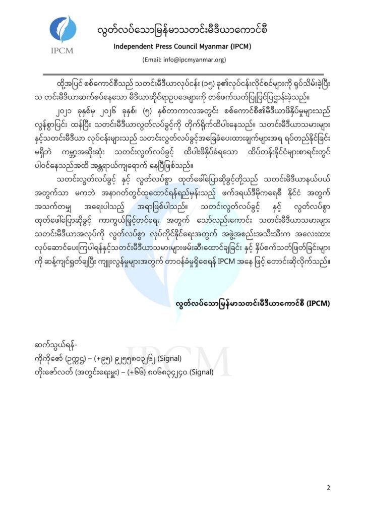 မတရားဖမ်းဆီးခံထားရသော သတင်းမီဒီယာသမားများနှင့်သက်ဆိုင်သော လွတ်လပ်သောမြန်မာသတင်းမီဒီယာကောင်စီ၏ ထုတ်ပြန်ကြေညာချက်