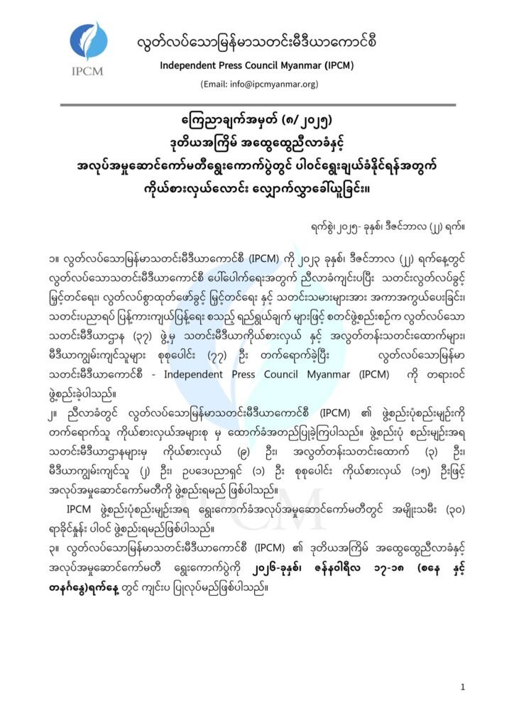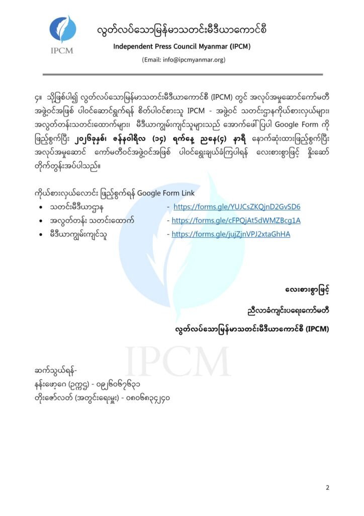 ၄။ သို့ဖြစ်ပါ၍ လွတ်လပ်သောမြန်မာသတင်းမီဒီယာကောင်စီ (IPCM) တွင် အလုပ်အမှုဆောင်ကော်မတီ အဖွဲ့ဝင်အဖြစ် ပါဝင်ဆောင်ရွက်ရန် စိတ်ပါဝင်စားသူ IPCM – အဖွဲ့ဝင် သတင်းဌာနကိုယ်စားလှယ်များ၊ အလွတ်တန်းသတင်းထောက်များ၊ မီဒီယာကျွမ်းကျင်သူများသည် အောက်ဖေါ်ပြပါ Google Form ကို ဖြည့်စွက်ပြီး ၂၀၂၆ခုနှစ်၊ ဇန်နဝါရီလ (၁၄) ရက်နေ့ ညနေ(၄) နာရီ နောက်ဆုံးထားဖြည့်စွက်ပြီး အလုပ်အမှုဆောင် ကော်မတီဝင်အဖွဲ့ဝင်အဖြစ် ပါဝင်ရွေးချယ်ခံကြပါရန် လေးစားစွာဖြင့် နှိုးဆော် တိုက်တွန်းအပ်ပါသည်။