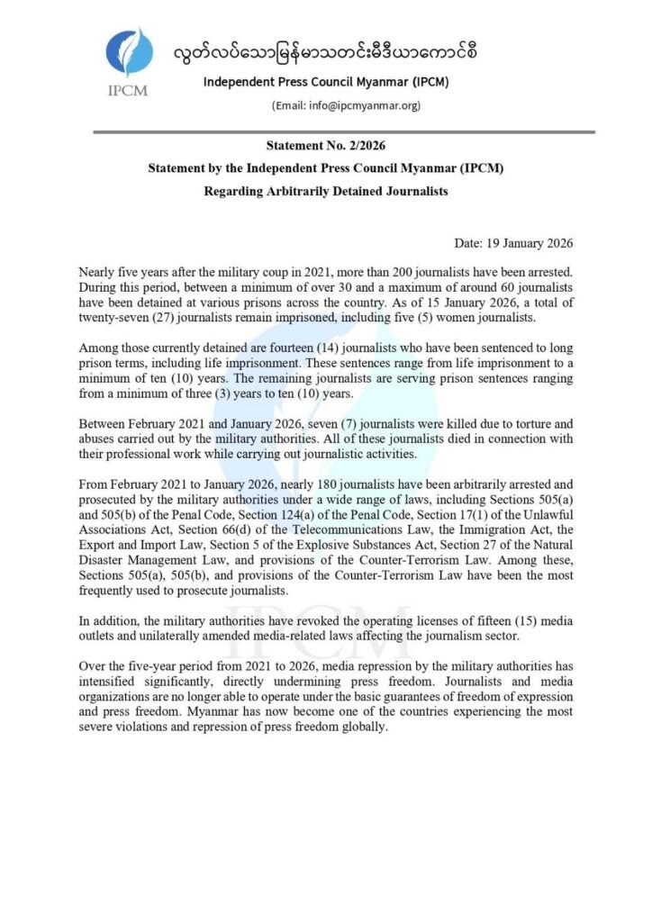 Nearly five years after the military coup in 2021, more than 200 journalists have been arrested. During this period, between a minimum of over 30 and a maximum of around 60 journalists have been detained at various prisons across the country. As of 15 January 2026, a total of twenty-seven (27) journalists remain imprisoned, including five (5) women journalists.