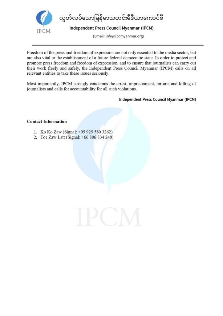 Freedom of the press and freedom of expression are not only essential to the media sector, but are also vital to the establishment of a future federal democratic state. In order to protect and promote press freedom and freedom of expression, and to ensure that journalists can carry out their work freely and safely, the Independent Press Council Myanmar (IPCM) calls on all relevant entities to take these issues seriously.